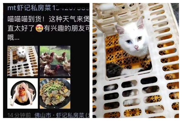 網友提供的截圖顯示,當天,名為「蝦記私房菜」的店家發布朋友圈稱,「喵喵喵到貨,這種天氣來煲龍虎鳳簡直太好了」,並配有多隻活貓被關在籠子裡的圖片,其中一隻異瞳白貓被抱到後廚屠宰台。