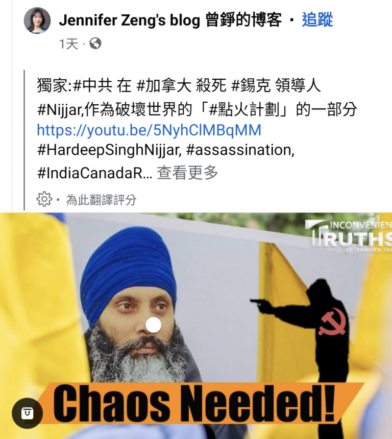 曾铮稍早在她个人脸书帐号Jennifer Zhen和X(推特)帐号曾铮真言指控:「中国共产党在加拿大杀害锡克教领袖尼贾尔,诬赖印度,这是(中国)扰乱世界的『点火计划』一环。」
