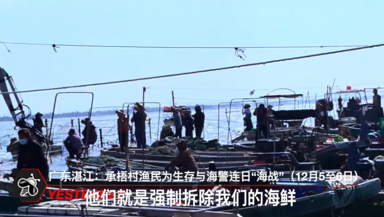 「广东湛江:承梧村渔民为生存与海警连日“海战”(12月5至6日)」广东湛江徐闻县西连镇承梧村的渔民与警察之间的冲突持续升级,事态已从陆地蔓延至海上。 继12月3日凌晨爆发冲突后,5日至6日,村民们连续两天驾驶渔船在海上与海警展开激烈对抗,阻止海警强行拆除他们的海上网箱,现场宛如小型海战。