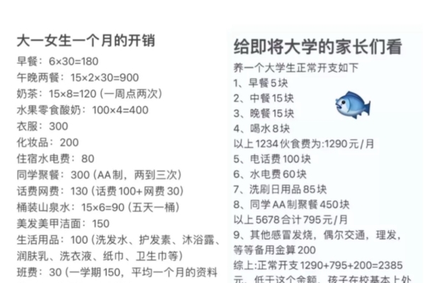 【2025年06月01日訊】(記者沈越報導)近日,「大學生每月生活費多少才夠用?」成為中國社交媒體熱議話題。一些學生曬出詳細賬單,表示1500元(人民幣,下同)甚至2000元「根本撐不到月底」;也有家長稱1500元已足夠,卻被學生反駁「沒錢就別生孩子」。這場討論不僅反映代際消費觀的差異,更揭示出在經濟下行壓力下,大學生生活費的不斷上升。