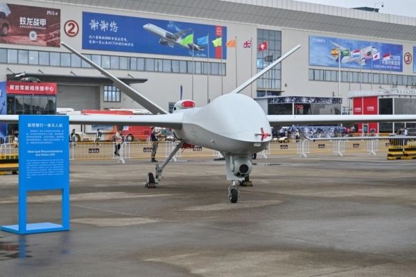 2024年11月14日,廣東省珠海市,第十五屆中國國際航空航天博覽會在此舉行,一架中國新型偵察打擊無人機在展會上展出。(Hector Retamal/AFP/Getty Images)