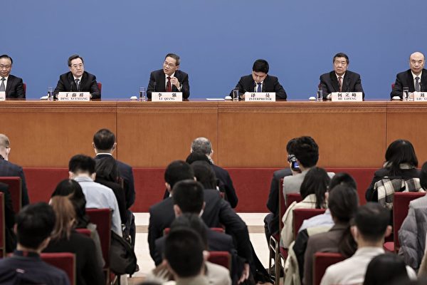 2023年3月13日,(左起)中共國務院副總理張國清、丁薛祥、總理李強、翻譯、副總理何立峰、劉國中在人大記者會上。(Lintao Zhang/Getty Images)