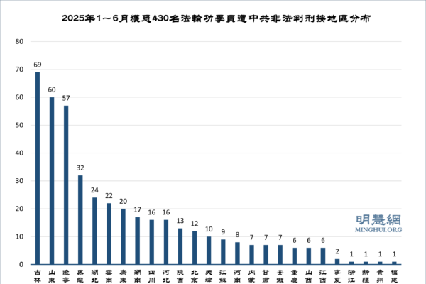 據明慧網報導統計,今年1月至6月份又獲知至少430名法輪功學員遭中共冤判,其中2025年有249人,其它不同年份有181人。