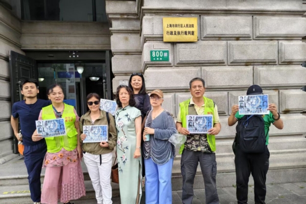上海訪民王惠芳民告官案於2025年6月4日開庭,30分鐘便草率結束。旁聽訪民合照。(受訪者提供)
