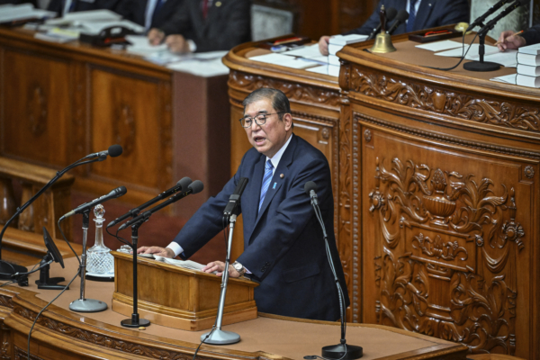 Japan's Prime Minister Shigeru Ishiba delivers a policy address during a plenary session of the Japanese National Diet's lower house in Tokyo on November 29, 2024. - Japan's prime minister said on November 29 he will have "frank discussions" with US president-elect Donald Trump, saying that cooperation between was vital to ensuring a "free and open Pacific". (Photo by Yuichi YAMAZAKI / AFP)