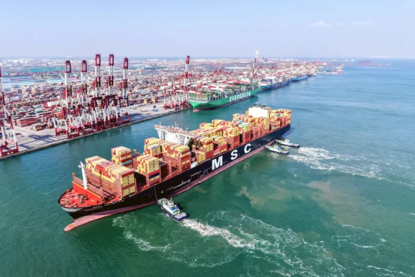 2025年2月23日,在中國山東省青島港,一艘集裝箱船在拖船的引導下駛向泊位。(STR/AFP via Getty Images)