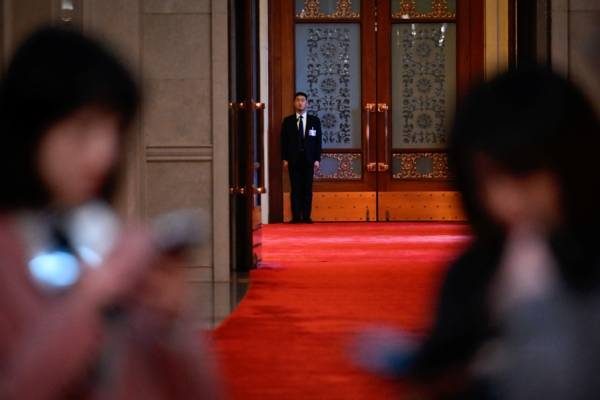 A security guard stands at the end of a corridor during the third session of the 14th National People's Congress (NPC) at the Great Hall of the People in Beijing on March 7, 2025. (Photo by WANG Zhao / AFP)