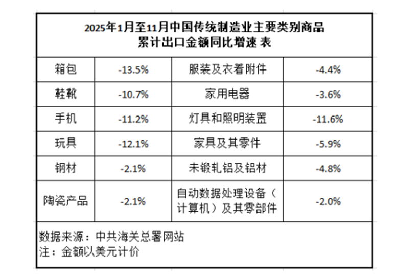 中共海关总署周一(12月8日)发布的11月份进出口数据显示,今年前11个月以劳动密集型产业为主的传统制造业出口额全面下滑,其中箱包、鞋靴、玩具和灯具等行业下滑均超过10%。此外,中国的手机出口则下滑了11.2%。