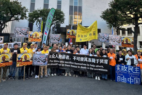 2024年10月20日,中國民主黨聯合總部組織洛杉磯華人到中共領館前聲援盧思位。(主辦方提供)