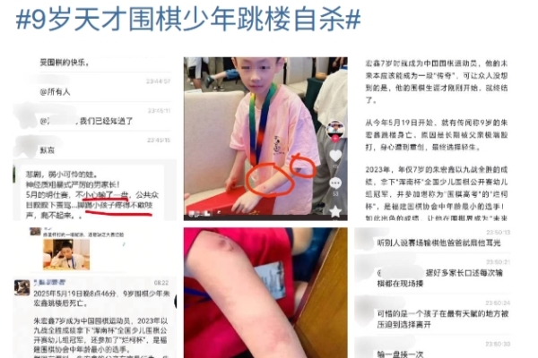 【2025年05月21日訊】5月20日,中國網路上爆出消息稱,不久前才升上業餘6段的9歲天才小棋手朱宏鑫不堪被父親長期家暴,於19日晚跳樓輕生。消息一出震驚全網。