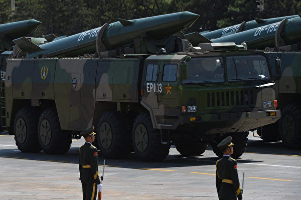 圖為2015年9月3日,中共閱兵式隊伍中的火箭軍「東風-15B」(DF-15B)導彈。(Greg Baker/AFP)