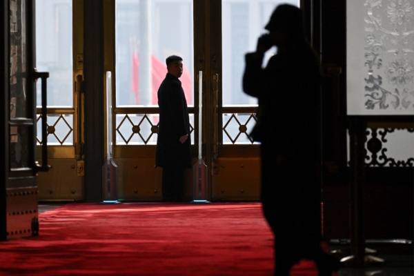A security official (L) stands guard during the opening session of the National People's Congress (NPC) at the Great Hall of the People in Beijing on March 5, 2025. (Photo by Jade Gao / AFP)