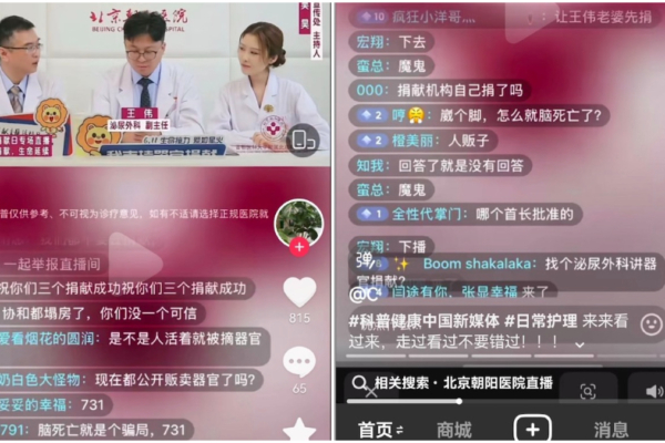 6月11日是中共的所謂「器官捐獻日」,北京朝陽醫院在當天組織了一場「中國器官捐獻日專場直播」,「科普器官捐獻知識」。直播間共3人,有兩名科室主任和一名該院宣傳處幹部。直播剛開始,屏幕上網友譴責謾駡的彈幕紛紛跳出。有網友表示,「主任帶著全家先捐」「你的孩子會捐嗎?」「祝你們三個捐獻成功」。