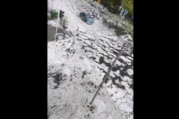網傳視頻顯示,冰雹密度很大,路面瞬間成「冰河」,白茫茫一片。由於冰雹突然來襲,有攤主來不及收攤。一視頻拍攝者還看到,有摩托車騎手被「冰河」阻在路口不敢過馬路。