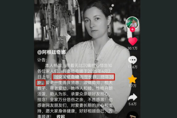 楊奇娜的丈夫楊淙發布訃告稱,妻子因突發低血糖過世,享年38歲。報導稱,病發時倒在客廳裡的楊奇娜,沒被及時發現,耽誤了救治時間,令許多粉絲不捨,紛紛湧入楊奇娜的抖音帳號悼念。