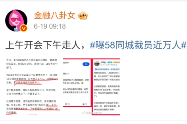 6月16日,在大陸職場社交平台脈脈上,多名認證為58同城員工的用戶爆料,近期58同城正在大規模裁員,儘管58同城給出的賠償方案為「N+1」,符合《勞動法》規定,但未提前給出任何預警,引發員工不滿,有員工表示,上午還在開會,下午便被約談,讓不少員工措手不及。