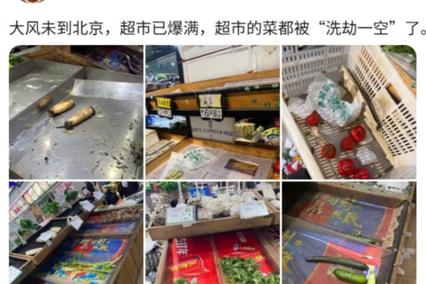 受此影響,有網民表示,北京超市已爆滿,「超市的菜都被『洗劫一空』了」。網民晒出的照片顯示,貨架上的蔬菜幾乎全被搶空。