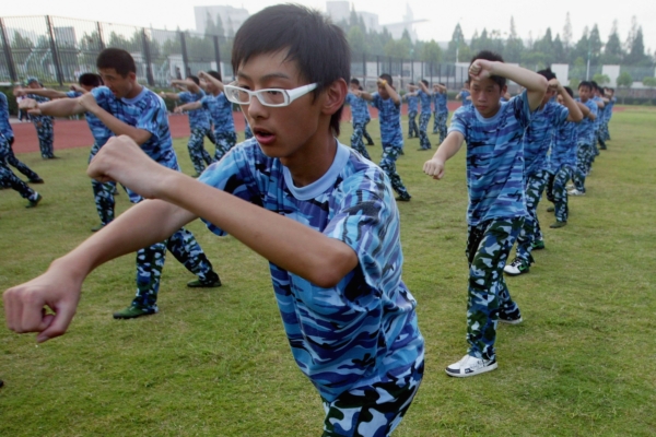 NANKING, CHINA - AUGUST 24: (CHINA OUT) New students from the Junior Middle School Affiliated to the Nanjing Normal University, attend a military training on August 24, 2007 in Nanking of Jiangsu Province, China. China implements a military training system in institutions of higher learning, senior middle schools and other corresponding schools, amounting to about 60 percent of university and college freshmen, to strengthen national defense education and patriotism, according to state media. (Photo by China Photos/Getty Images)