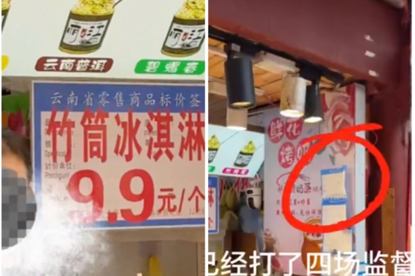 網傳視頻顯示,該茶飲店店內一塊價牌標有「竹筒冰淇淋9.9元/個」,紅色字體很醒目。但據女遊客於視頻中表示,「我點完之後收我48。」女遊客問48元的價籤在哪兒?店員指給她看,才發現原來價籤貼在一處不起眼的牆壁上。