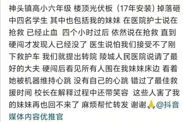據網友在社交平台發文稱,(山東省德州市陵城區)神頭鎮高小樓頂光伏板掉落,砸中四名學生,他的妹妹是其中之一。到醫院後,護士告訴家屬在搶救,已經止血,但家屬等了四小時,醫院依然說在搶救,家屬闖入搶救室才發現人已經沒了,醫院用機器維持著心跳。
