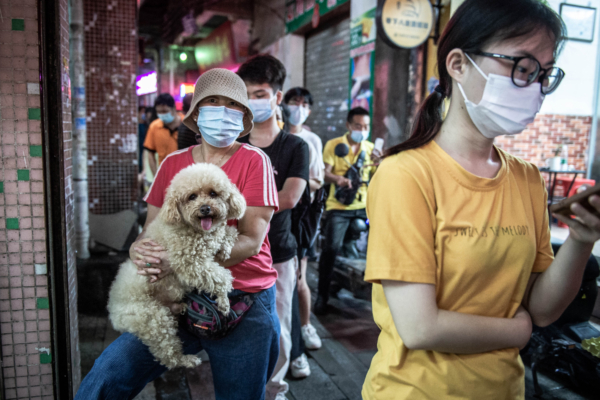 This photo taken on April 28, 2022 shows a woman holding a dog as she queues to undergo nucleic acid tests for the Covid-19 coronavirus in Guangzhou, in China's southern Guangdong province on April 29, 2022. - China OUT (Photo by AFP) / China OUT (Photo by STR/AFP via Getty Images)