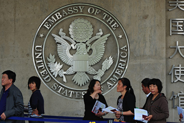 圖為美國駐華大使館門外,中國民眾在排隊辦理簽證。(Mark Ralston/AFP/GettyImages)