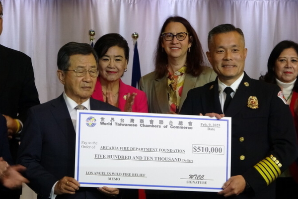 中華民國駐洛杉磯辦事處9日與世界台灣商會聯合總會共同舉行捐贈儀式,官方與民間聯手,分別捐出50萬美元。世界台灣商會聯合總會的50萬美元將捐給亞凱迪亞市(Arcadia)消防局基金會用來籌建訓練中心。