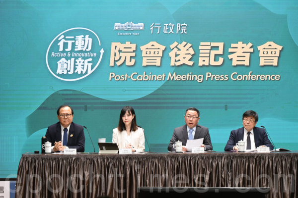 2025年4月17日,中華民國行政院發言人李慧芝(左2)主持行政院會後記者會,包括行政院人事行政總處人事長蘇俊榮(左1)等人出席。(宋碧龍/大紀元)