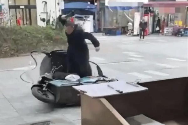 網傳視頻顯示,一人隨車倒地後,站在一旁的黑衣男子持械不斷使勁抽打,倒地人員雙手護頭,艱難地嘗試站起。有網友稱是保安毆打外賣員。