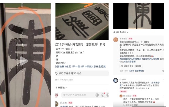 有網友「青春的泥沼」發文稱,尷尬了,一堆人說故宮下雨很好,故宮也防水。結果多位網友爆料,故宮午門的展廳直接閉展,原因是展廳漏雨,直接滴到正在展出的文徵明的書畫作品上了。