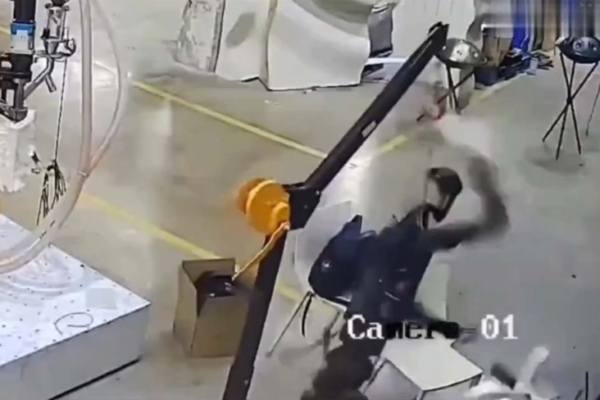 網傳視頻顯示,大陸國產機器人突然「發狂」般地亂掄手臂,場面異常恐怖,旁邊的操作員嚇得連忙逃避。