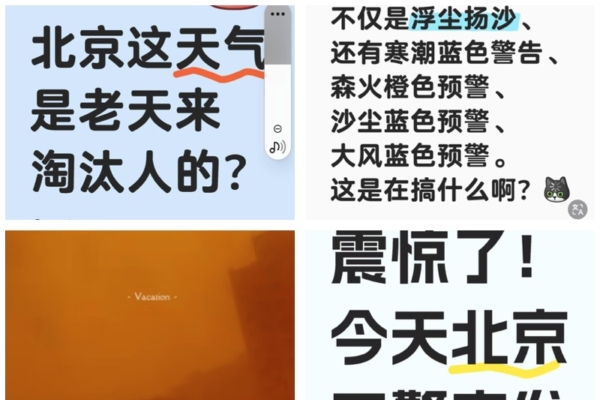 北京一名互聯網從業者近日也發文感嘆:「北京這天氣是老天來淘汰人的?」 她說:「北京最近幾天最高氣溫27℃,下週又要回歸到3℃。 忽冷忽熱的氣溫,加上大風配合花粉和塵土濃度開始加大,讓我這個之前從不過敏的人都開始過敏鼻炎了,淚流滿面,打工牛馬甚是辛苦。 」