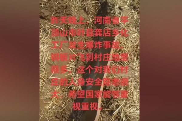 9日,當地一網友發視頻稱,昨天晚上,平頂山葉縣龔店化工廠發生爆炸,許多鋼板碎片落到村莊的地裡,給村民的人身安全造成威脅。