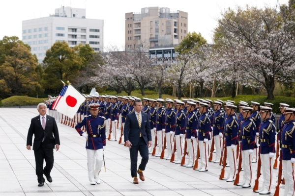Japan's Defence Minister Gen Nakatani (L) and US Secretary of Defence Pete Hegseth review an honor guard during a welcome ceremony at the Ministry of Defence in Tokyo on March 30, 2025. (Photo by Kiyoshi Ota / various sources / AFP)