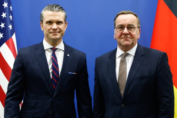 2025年2月12日,在布魯塞爾北約總部舉行的北約國防部長會議前夕,美國國防部長皮特‧海格塞斯(左,Pete Hegseth)與德國國防部長鮑里斯‧皮斯托利斯(Boris Pistorius)合影。(Johanna Geron/POOL/AFP)