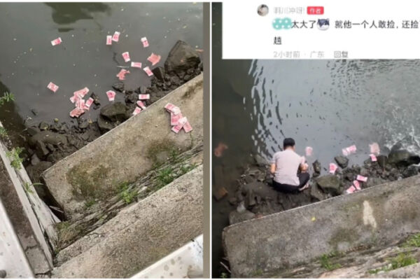 網傳視頻顯示,6月12日,深圳寶安區新安街道附近橋下,十餘紮百元人民幣鈔票散落在河岸和水裡,岸邊還有幾疊。一名男子正在拿著袋子撿,很快就撿滿一袋子,之後爬上河邊護欄,將鈔票放入一輛車上,有許多人在圍觀。
