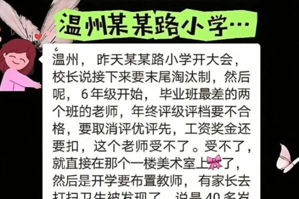網傳消息還稱,方老師自殺的原因之一是,學校對畢業班的考核太嚴了,要是任教老師帶的班級成績排名在最後兩名,不僅年度考核會被評為不合格,績效也沒了。而且相關會議還明明白白地提出了末位淘汰制,最差兩個班的老師評優評先沒資格,工資獎金也要扣罰。另一個原因是,班上有個要去特殊學校的孩子的家長向學校投訴了方老師,校長還當著全校老師的面斥責了方老師。