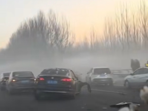 2月3日早上,瀋海高速遼寧鞍山路段,疑因大霧可見性低,發生多車連環相撞事故。據目擊者表示,至少有二十多輛車相撞。(視頻截圖)