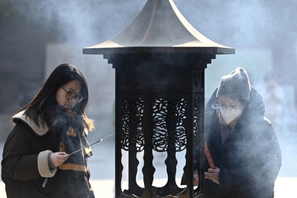2025年1月23日,人們在北京白雲觀祈福前焚香,慶祝1月29日開始的黃曆新年。(PEDRO PARDO/AFP via Getty Images)