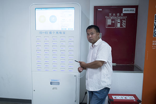 圖為示意圖。圖為2017年7月5日,上海一名男子在一家商店內的共享充電站上為手機充電。(Johannes Eisele/AFP)