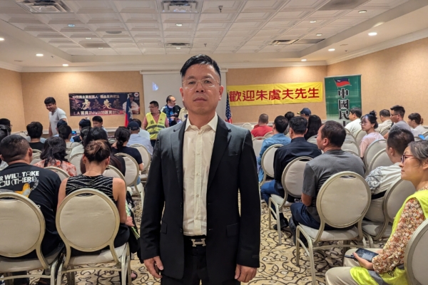 圖為2024年8月25日,現居洛杉磯的中國民主黨成員、前湖北省企業家肖運軍參加中國民主黨創黨元老朱虞夫歡迎會。(陳德怡/大紀元)