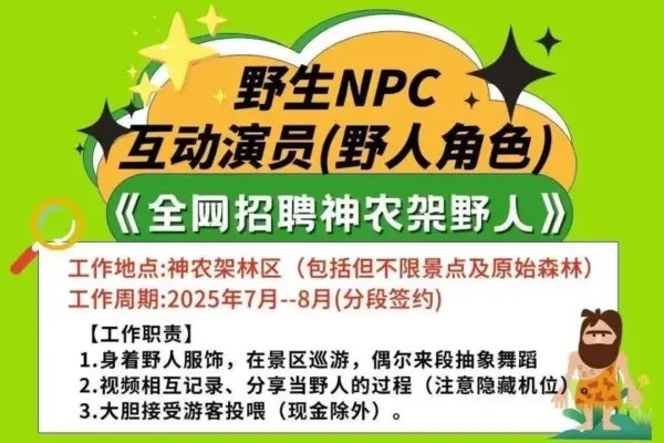 【2025年06月10日訊】(記者沈越報導)湖北神農架國家級風景區近日發布的一則「野人NPC招聘啟事」在社交網絡上迅速走紅:只需穿上野人服飾,在景區內巡遊與遊客互動,即可獲得日薪500元(人民幣,下同)的報酬。該招聘啟事短時間內吸引超過4000人報名。有業內人士表示,神農架景區的「野人計劃」揭示地方政府在財政枯竭壓力下的「荒誕式自救」。