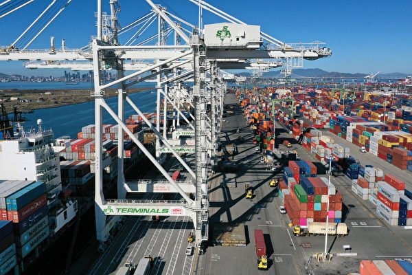 2025年3月4日,美國對中國商口新增的10%關稅生效。中共隨即對美國的雞肉棉花等商品加徵15%關稅。有中國企業主表示,美國加稅對中國企業是災難性的。圖為2021年10月14日,堆放在加州奧克蘭港碼頭上的貨櫃。(Justin Sullivan/Getty Images)