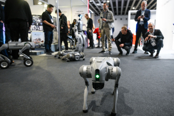 The four legged Go2-W robots from Unitree robotics are displayed during the MWC (Mobile World Congress), the world's biggest mobile fair, in Barcelona on March 3, 2025. Surrounded by investment and innovation projects, the Mobile World Congress (MWC) kicks off today in Barcelona amid a context of euphoria but also tensions over artificial intelligence (AI), whose rapid advancement is shaking up the tech sector. (Photo by Josep LAGO / AFP) (Photo by JOSEP LAGO/AFP via Getty Images)