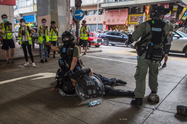 TOPSHOT - Riot police detain a man as they clear protesters taking part in a rally against a new national security law in Hong Kong on July 1, 2020, on the 23rd anniversary of the city's handover from Britain to China. - Hong Kong police made the first arrests under Beijing's new national security law on July 1 as the city greeted the anniversary of its handover to China with protesters fleeing water cannon. (Photo by DALE DE LA REY / AFP) (Photo by DALE DE LA REY/AFP via Getty Images)
