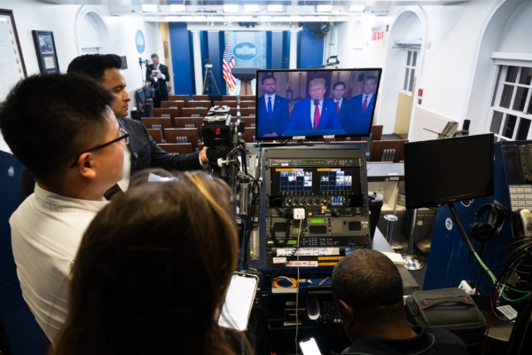 2025年6月21日,記者在華盛頓特區白宮布雷迪新聞發布室觀看美國總統川普就美國轟炸伊朗核設施發表全國演說。 (SAUL LOEB/AFP via Getty Images)