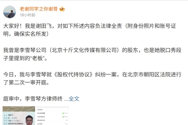據網民「@老謝同學之你謝哥」謝田飛6月17日深夜在微博發帖表示,他曾是李雪琴公司(北京十斤文化傳媒有限公司)的股東,也是她訪問節目段子裡提到的「老闆」。他與李雪琴《股權代持協議》糾紛一案,17日在北京朝陽區法院一審。庭審中,李雪琴的律師提交了北京十斤文化傳媒有限公司的清算報告。