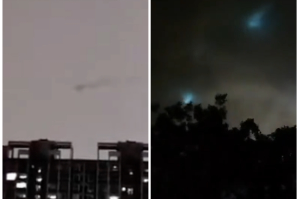 視頻中,天空不斷電閃雷鳴,一條黑色不明飛行物在夜空中忽隱忽現。有市民還拍錄下一段低沉的咆哮聲,極具穿透力。