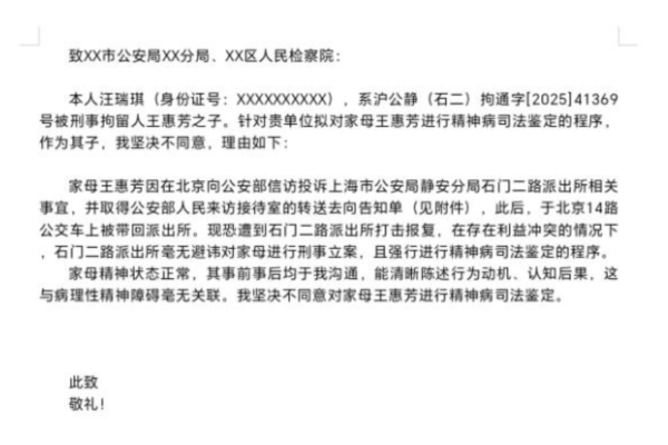 汪瑞琪已致信公安局、檢察院等有關機關,信中道:「針對貴單位擬對家母王惠芳進行精神病司法鑒定的程序, 作為其子,我堅決不同意。」