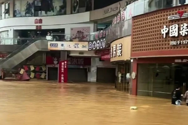 有多名當地網民發布汛情視頻,有視頻顯示縣城最大最熱鬧的商場——常馳廣場已被淹,商場內部的洪水如瀑布般倒灌。